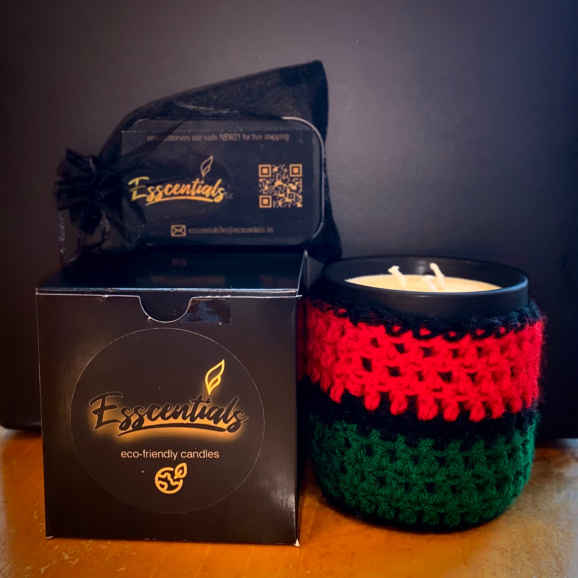 keep your candle warm and cozy with our candle sweaters pick from 2 options; esscentials black or the people, the blood, the beauty kwanzaa inspired sweater